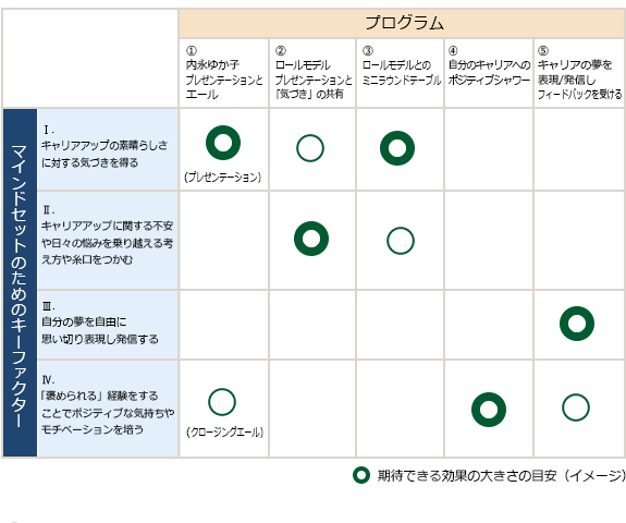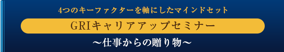 「GRIキャリアアップセミナー~仕事からの贈り物~」では、キャリアアップに対するマインドセットを促すために、4つのキーファクターを軸にして、プログラムを組み立てています。