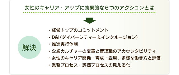 個々の企業が抱える“女性活用”の課題は千差万別です。多くの企業の経営層や人事から「女性の活用が必要なことは理解しているが、どうしたらいいかわからない」「女性活用施策を展開しているが、効果を加速させたい」「ダイバーシティに精通した人材がいない」という声をよく聞きます。また働く女性の側からも「育児休暇から復帰できる自信がない」といった不安が挙がっています。GRIはそうした悩みに対して、個々の企業が抱える問題点を明確にした上で、具体的なアクションプランをご提案いたします。