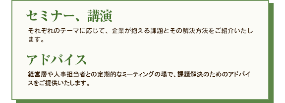 GRIでは、多様な人材の活用こそが、これからの企業の競争力を創ると考えています。私達がこれまで実践を通じて蓄積してきた豊富なグローバルオペレーションの経験から、ダイバーシティを実現する様々なアドバイスをご提案いたします。